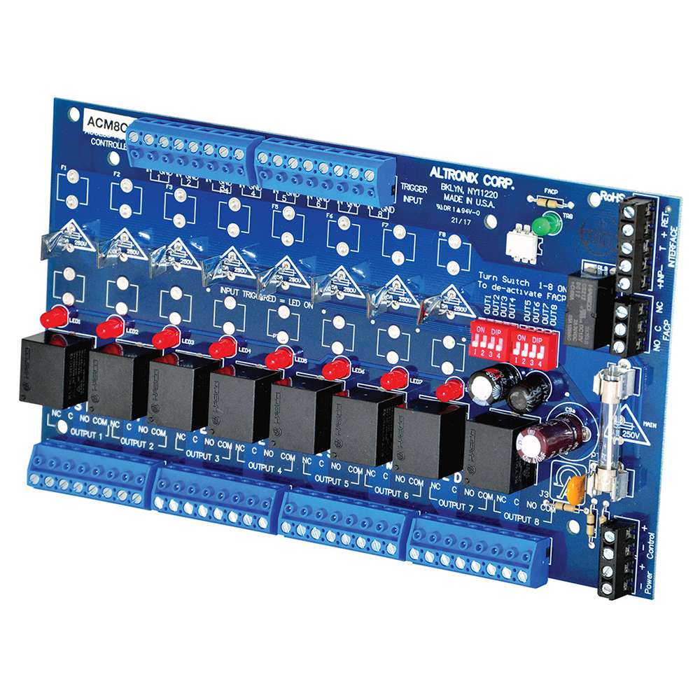 Altronix ACM8CB converts one (1) 12 to 24 volt AC or DC input into eight (8) independently controlled Class 2 PTC protected power-limited auto-resettable outputs rated at 2.5A each. Outputs are activated by an open collector sink or normally open (NO) dry trigger input form an Access Control System, Card Reader, Keypad, Push Button, PIR, etc. The ACM8CB will route power to a variety of access control hardware devices including Mag Locks, Electric Strikes, Magnetic Door Holders, etc. Outputs will operate in both Fail-Safe and/or Fail-Secure modes.