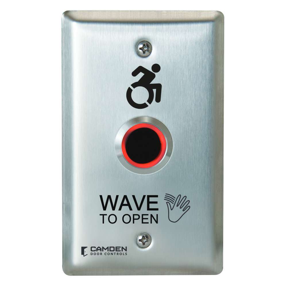 ValueWaveâ„¢ hands free switches are both water resistant and offer a built-in light ring standard ; CM-221 for red/green or CM-222 for blue/green illumination. Camden ValueWaveâ„¢ 12/24 VDC touchless switches with 1 relay are IP 65 rated for indoor/outdoor use, ideal for use in automatic door/access control systems. These switches are designed for easy installation and trouble-free service in high traffic applications. CM-221 are available in single, narrow and double gang stainless steel faceplates and graphics.