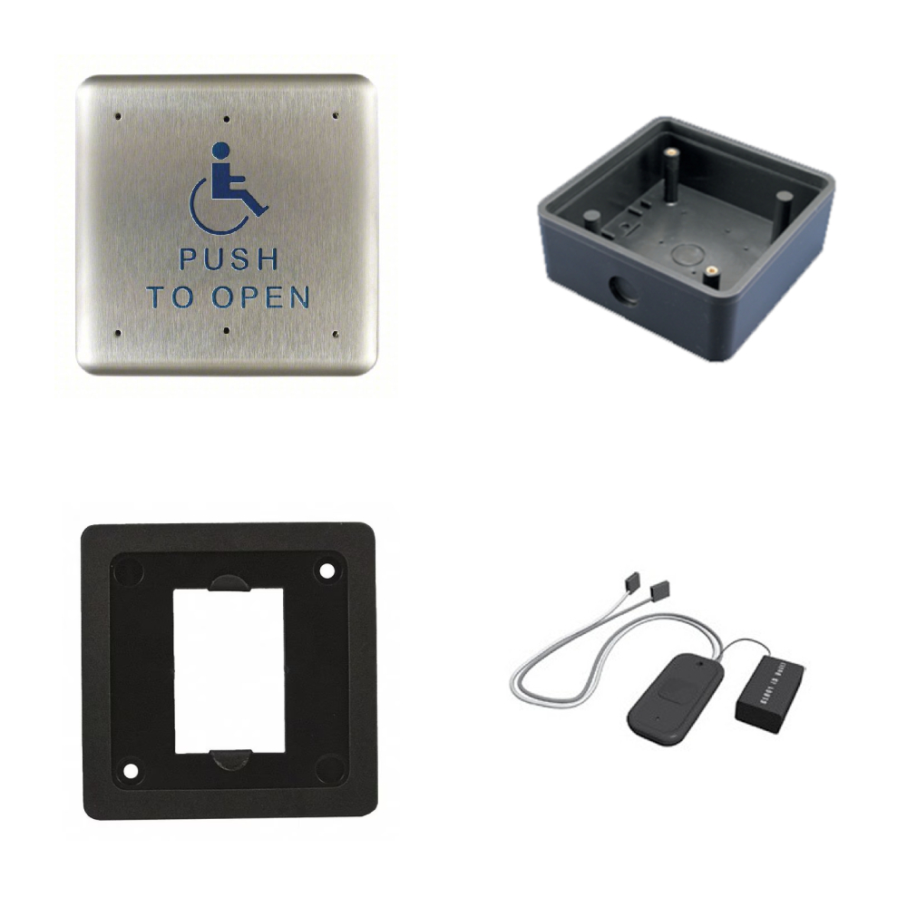 4.75 Inch x 4.75 InchSquare Design. Universal Wheelchair Accessibility Logo and "Push To Open" Text. Can mount in a flush box, surface box, bollard post, or standard single gang electrical j-box. Vandal resistant and Weather resistant.