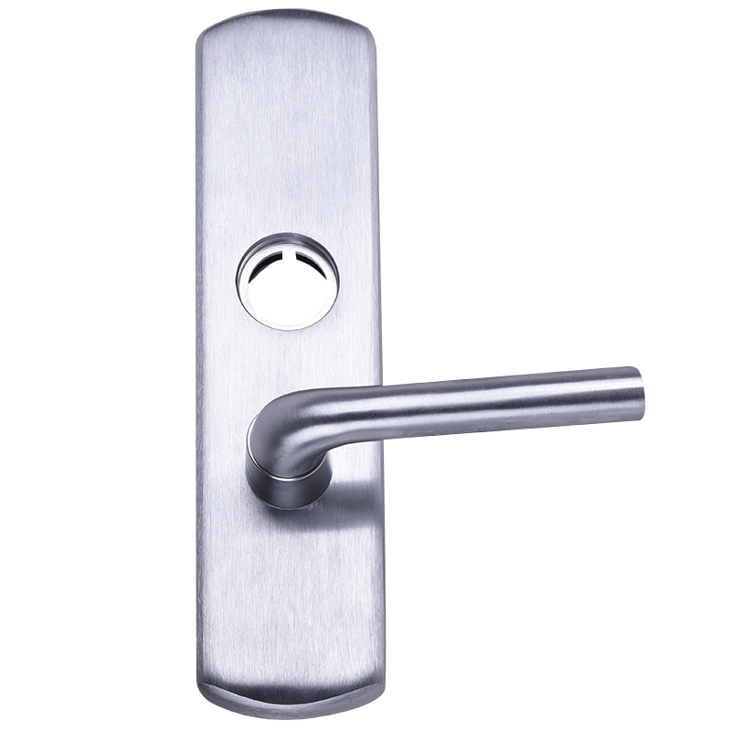 Von Duprin exit device trim for 98/99 series rim and vertical rod devices. The 996EO Exit Only Plate Trim is one of the standard trims for the 98 and 99 series Von Duprin panic bars. It is an exit only plate trim which means there is no handle or opening mechanism. This does not allow entry through the door once you exit.