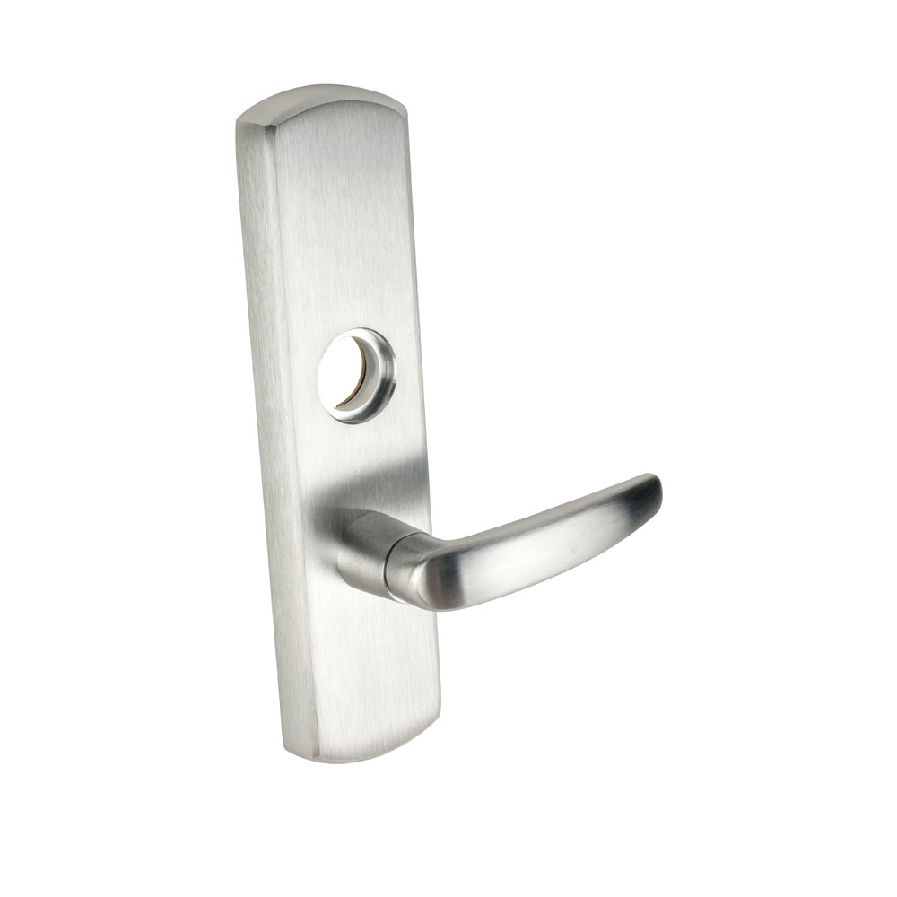 Von Duprin exit device trim for 98/99 series rim and vertical rod devices. The 996EO Exit Only Plate Trim is one of the standard trims for the 98 and 99 series Von Duprin panic bars. It is an exit only plate trim which means there is no handle or opening mechanism. This does not allow entry through the door once you exit.