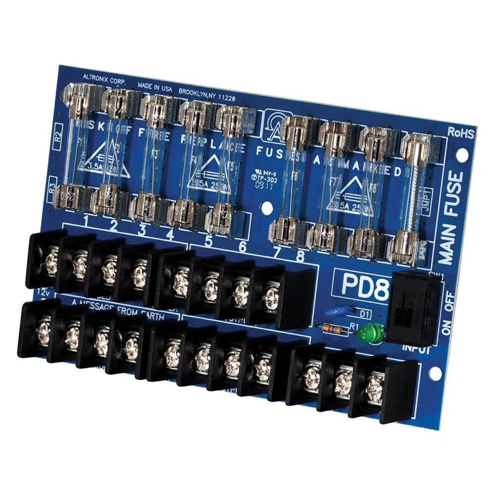 Altronix PD8 Series power distrubtion module is designed to convert a single AC or DC input into eight (8) individually fuse protected outputs.