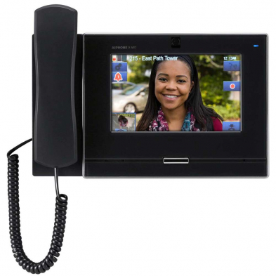 The IX-MV7-HB SIP Complaint Video Master Station is an IP addressable hands-free or handset master station with a 7 color touchscreen. It can be wall or desk mounted (desk stand included). Features video entry security, internal communication, and emergency stations.