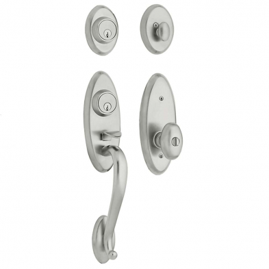 Greet your guests in style with this classically styled entrance set. The single cylinder deadbolt locks and unlocks from the inside with a turn-button, and from the outside with a key. Two-Point means there are two points of locking on the mechanism. There is one deadbolt on the same plate as the handle and another deadbolt above the handle.