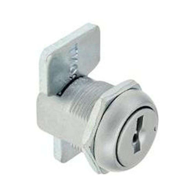 T-cam desk lock - type 1975 supplied keyed alike to key number 1289. Commonly used on metal desk furniture and other ulititly lock applications. Lock is sub-assembled to be assembled when installing in desk drawer. CompX Chicago disc tumbler metal drawer cabinet lock, insertable bolt, 21/32" from inside of lock face to front of bolt, 11/32" bolt throw, 180 degree CW rotation, overall cylinder length 57/64", keyed alike to 1289 and 1454, 200 keyed different codes, satin chrome finish