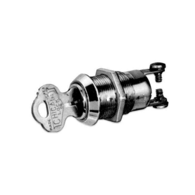 CompX Chicago double bit, switch lock, single pole, single throw, key pull at off only. Momentary contact switch operated by manually rotating inserted key 90° clockwise from open to closed position.7 amps @ 28 VAC/VDC, electrical Life: 6,000 cycles @ Max. Load. Contact Resistance: 50 milliohms initial maximum, bright chrome finish, two keys per lock. Master keying not available. Keyed alike to 2001, 2007 and 2126, 200 keyed different codes
