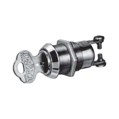 CompX Chicago double bit, switch lock, single pole, single throw, key pull at off only. Momentary contact switch operated by manually rotating inserted key 90° clockwise from open to closed position.7 amps @ 28 VAC/VDC, electrical Life: 6,000 cycles @ Max. Load. Contact Resistance: 50 milliohms initial maximum, bright chrome finish, two keys per lock. Master keying not available. Keyed alike to 2001, 2007 and 2126, 200 keyed different codes