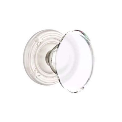 The Crystal Collection's knob / lever handles are supported by springs mounted behind the rosettes and sideplates, which return the handles back to the rest position and prevent lever sag. The latches are heavy-duty die case construction, with strong internal springs, solid brass nose bolts, and sintered metal cams. A plastic bushing located in the joint between the handle and the rosette ensures a friction-free wear surface, preventing metal from bearing on metal and providing smooth, long-lasting operation. Handles are positvely connected to rosettes with a permanent clip. Each has a set screw which eliminates "handle wobble" when tightened. Emtek's threaded tubes are machined brass to ensure good threads and prevent corrosion.
