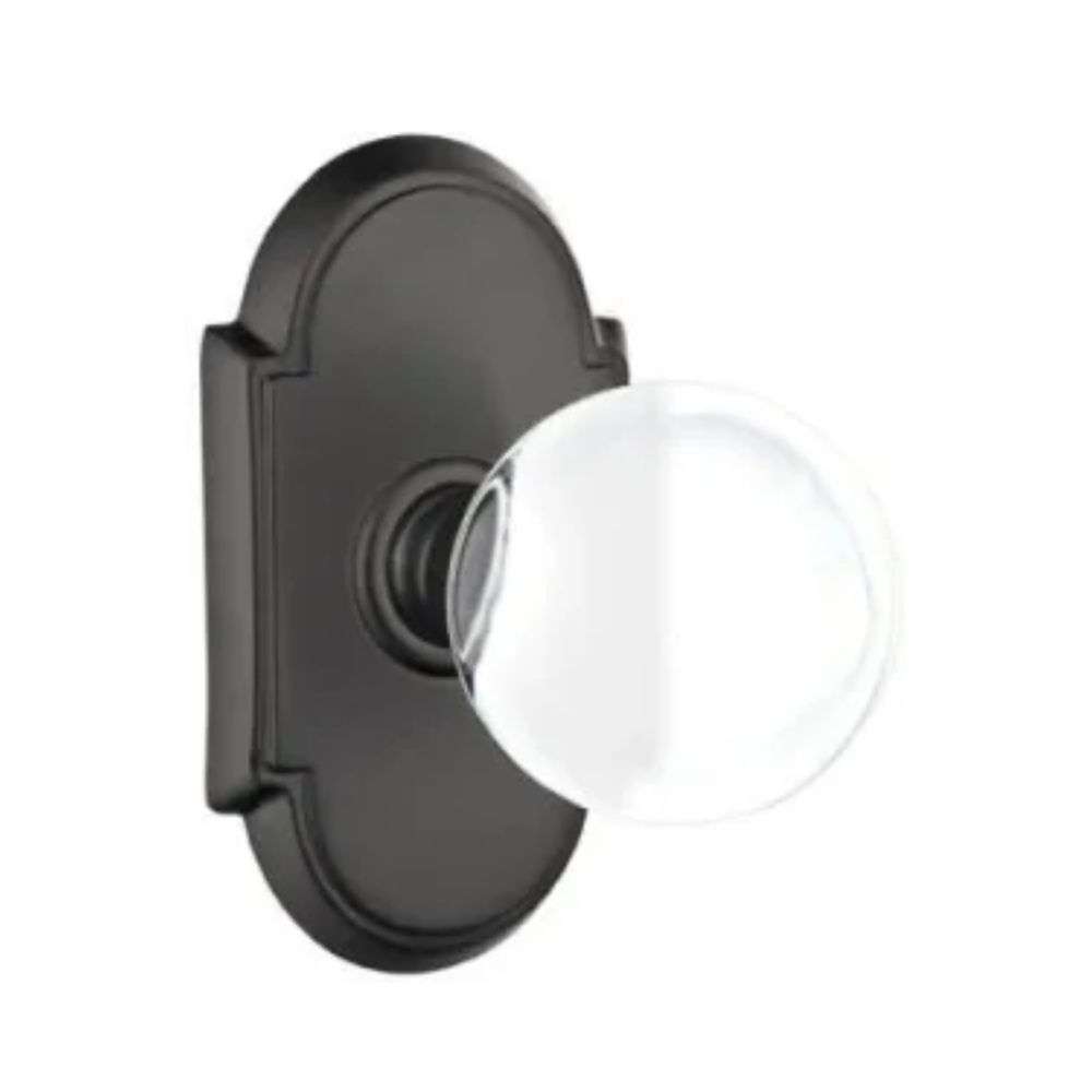 The Crystal Collection's knob / lever handles are supported by springs mounted behind the rosettes and sideplates, which return the handles back to the rest position and prevent lever sag. The latches are heavy-duty die case construction, with strong internal springs, solid brass nose bolts, and sintered metal cams. A plastic bushing located in the joint between the handle and the rosette ensures a friction-free wear surface, preventing metal from bearing on metal and providing smooth, long-lasting operation. Handles are positvely connected to rosettes with a permanent clip. Each has a set screw which eliminates "handle wobble" when tightened. Emtek's threaded tubes are machined brass to ensure good threads and prevent corrosion.