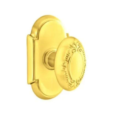 The Brass Designer Collection's knob / lever handles are supported by springs mounted behind the rosettes and sideplates, which return the handles back to the rest position and prevent lever sag. The latches are heavy-duty die case construction, with strong internal springs, solid brass nose bolts, and sintered metal cams. A plastic bushing located in the joint between the handle and the rosette ensures a friction-free wear surface, preventing metal from bearing on metal and providing smooth, long-lasting operation. Handles are positvely connected to rosettes with a permanent clip. Each has a set screw which eliminates "handle wobble" when tightened. Emtek's threaded tubes are machined brass to ensure good threads and prevent corrosion.