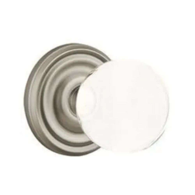 The Crystal Collection's knob / lever handles are supported by springs mounted behind the rosettes and sideplates, which return the handles back to the rest position and prevent lever sag. The latches are heavy-duty die case construction, with strong internal springs, solid brass nose bolts, and sintered metal cams. A plastic bushing located in the joint between the handle and the rosette ensures a friction-free wear surface, preventing metal from bearing on metal and providing smooth, long-lasting operation. Handles are positvely connected to rosettes with a permanent clip. Each has a set screw which eliminates "handle wobble" when tightened. Emtek's threaded tubes are machined brass to ensure good threads and prevent corrosion.