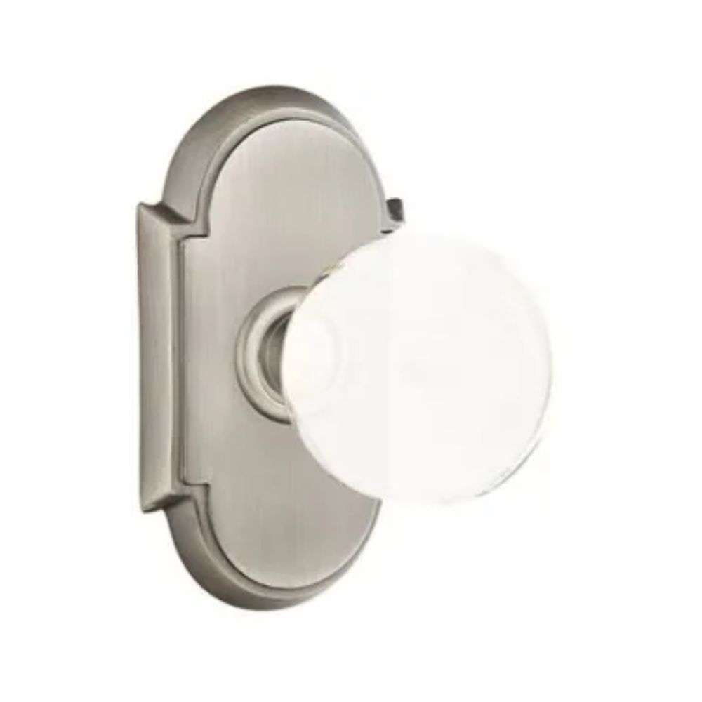 The Crystal Collection's knob / lever handles are supported by springs mounted behind the rosettes and sideplates, which return the handles back to the rest position and prevent lever sag. The latches are heavy-duty die case construction, with strong internal springs, solid brass nose bolts, and sintered metal cams. A plastic bushing located in the joint between the handle and the rosette ensures a friction-free wear surface, preventing metal from bearing on metal and providing smooth, long-lasting operation. Handles are positvely connected to rosettes with a permanent clip. Each has a set screw which eliminates "handle wobble" when tightened. Emtek's threaded tubes are machined brass to ensure good threads and prevent corrosion.