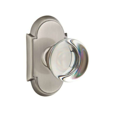 The Crystal Collection's knob / lever handles are supported by springs mounted behind the rosettes and sideplates, which return the handles back to the rest position and prevent lever sag. The latches are heavy-duty die case construction, with strong internal springs, solid brass nose bolts, and sintered metal cams. A plastic bushing located in the joint between the handle and the rosette ensures a friction-free wear surface, preventing metal from bearing on metal and providing smooth, long-lasting operation. Handles are positvely connected to rosettes with a permanent clip. Each has a set screw which eliminates "handle wobble" when tightened. Emtek's threaded tubes are machined brass to ensure good threads and prevent corrosion.