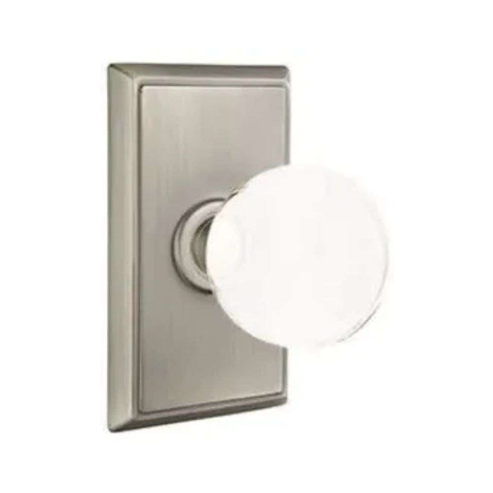 The Crystal Collection's knob / lever handles are supported by springs mounted behind the rosettes and sideplates, which return the handles back to the rest position and prevent lever sag. The latches are heavy-duty die case construction, with strong internal springs, solid brass nose bolts, and sintered metal cams. A plastic bushing located in the joint between the handle and the rosette ensures a friction-free wear surface, preventing metal from bearing on metal and providing smooth, long-lasting operation. Handles are positvely connected to rosettes with a permanent clip. Each has a set screw which eliminates "handle wobble" when tightened. Emtek's threaded tubes are machined brass to ensure good threads and prevent corrosion.