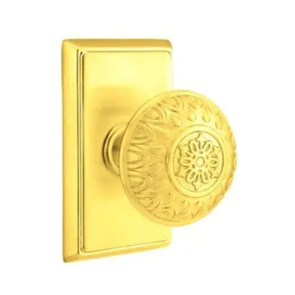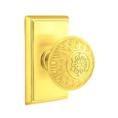 The Brass Designer Collection's knob / lever handles are supported by springs mounted behind the rosettes and sideplates, which return the handles back to the rest position and prevent lever sag. The latches are heavy-duty die case construction, with strong internal springs, solid brass nose bolts, and sintered metal cams. A plastic bushing located in the joint between the handle and the rosette ensures a friction-free wear surface, preventing metal from bearing on metal and providing smooth, long-lasting operation. Handles are positvely connected to rosettes with a permanent clip. Each has a set screw which eliminates "handle wobble" when tightened. Emtek's threaded tubes are machined brass to ensure good threads and prevent corrosion.