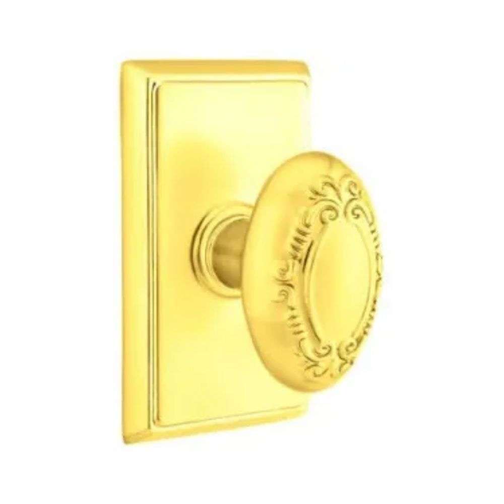 The Brass Designer Collection's knob / lever handles are supported by springs mounted behind the rosettes and sideplates, which return the handles back to the rest position and prevent lever sag. The latches are heavy-duty die case construction, with strong internal springs, solid brass nose bolts, and sintered metal cams. A plastic bushing located in the joint between the handle and the rosette ensures a friction-free wear surface, preventing metal from bearing on metal and providing smooth, long-lasting operation. Handles are positvely connected to rosettes with a permanent clip. Each has a set screw which eliminates "handle wobble" when tightened. Emtek's threaded tubes are machined brass to ensure good threads and prevent corrosion.