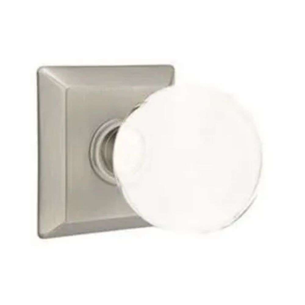The Crystal Collection's knob / lever handles are supported by springs mounted behind the rosettes and sideplates, which return the handles back to the rest position and prevent lever sag. The latches are heavy-duty die case construction, with strong internal springs, solid brass nose bolts, and sintered metal cams. A plastic bushing located in the joint between the handle and the rosette ensures a friction-free wear surface, preventing metal from bearing on metal and providing smooth, long-lasting operation. Handles are positvely connected to rosettes with a permanent clip. Each has a set screw which eliminates "handle wobble" when tightened. Emtek's threaded tubes are machined brass to ensure good threads and prevent corrosion.