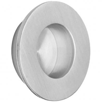 The Round Brushed Stainless Steel Flush Pull has a 2 inch diameter. The 2 Inch Brushed Stainless Steel Round Sliding Door Pull is usually used on sliding pocket doors. It has a brushed stainless steel finish. The 2 Inch Brushed Stainless Steel Round Sliding Door Pull is mortised into the face of the door.