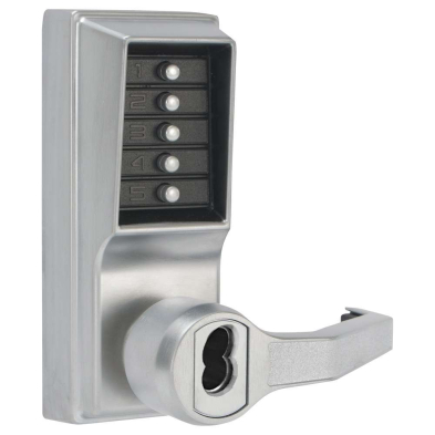 The Simplex 8100 Mechanical pushbutton lock, with mortise locking device options and lever handle, provides exterior access by combination, while allowing free egress.