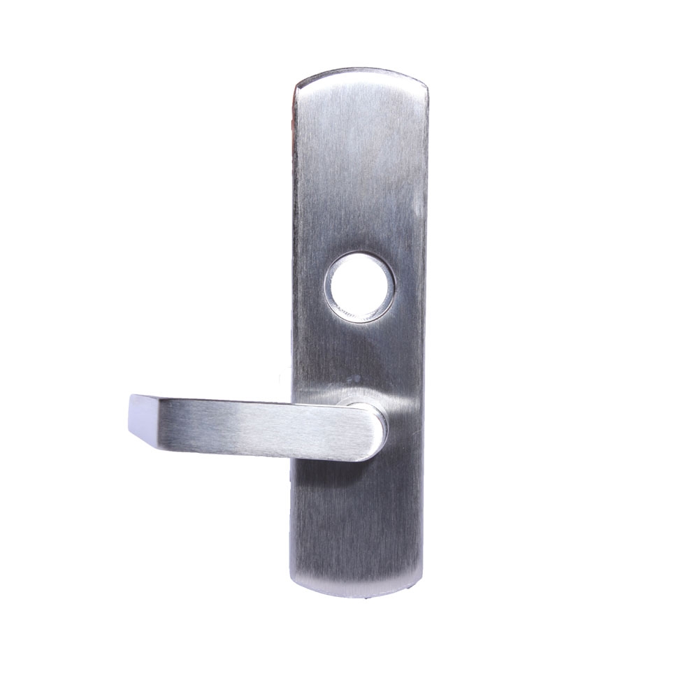 Von Duprin exit device trim for 98/99 series rim and vertical rod devices. The 996EO Exit Only Plate Trim is one of the standard trims for the 98 and 99 series Von Duprin panic bars. It is an exit only plate trim which means there is no handle or opening mechanism. This does not allow entry through the door once you exit.