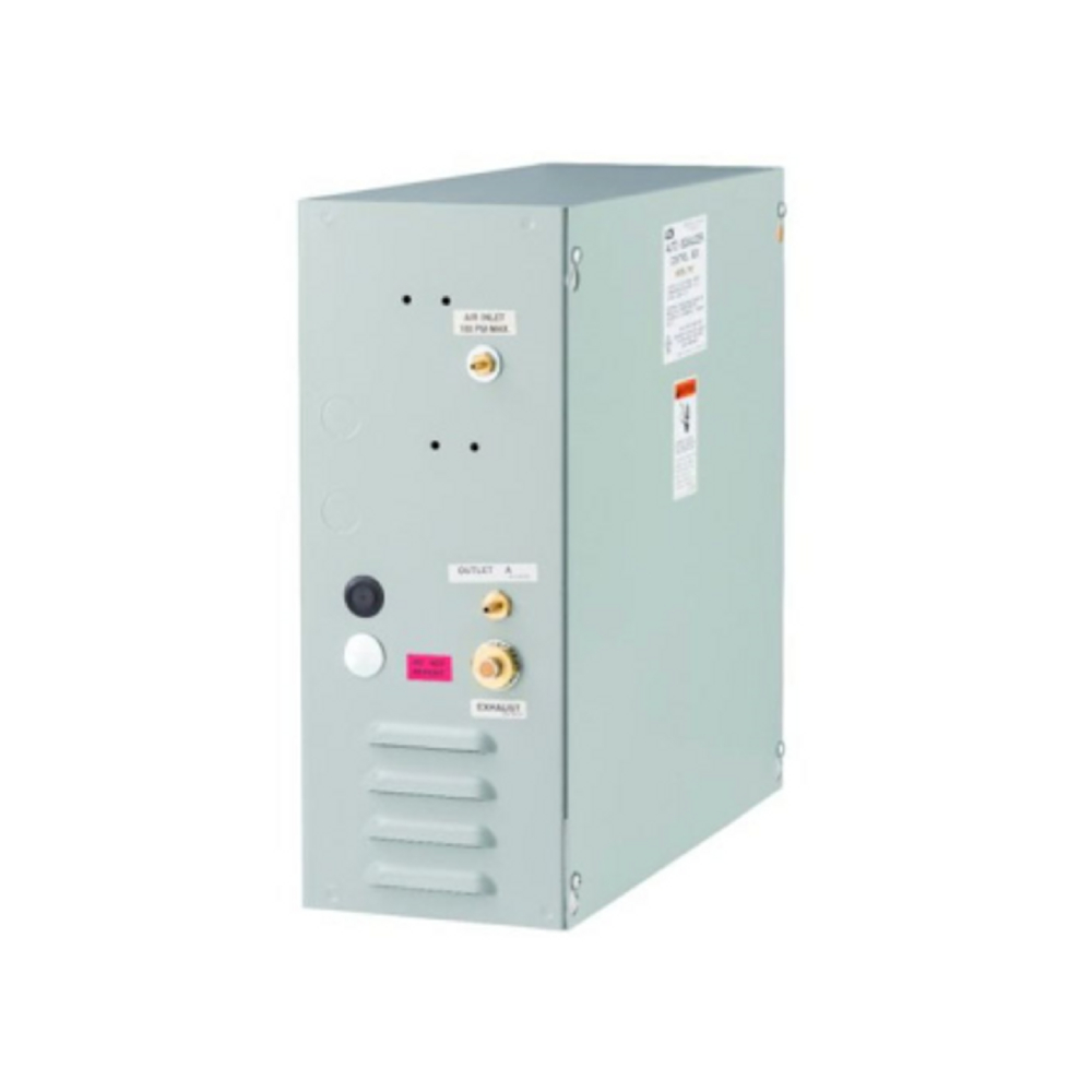 Heavy duty, surface mounted control box contains one or two electrically controlled pneumatic circuits. Air filtration, pneumatic regulation, and system timing is performed by the control box. 7980 series control boxes also contain a built-in air pump to power the system. Each pneumatic circuit can be adjusted for a hold open time up to 30 seconds. Output air pressure can be adjusted to precisely tailor system to individual door requirements. Pneumatic connections use standard barbed fittings and 925 tubing from the compressor to the control box to the operator. A package of barbed tee and butt connectors are supplied with each control box to simplify installations. Self-contained control box/compressor combination for independent or simultaneous operation of two door leaves. Two independent pneumatic circuit accepts normally open (N.O.) inputs from hardwired or RF (wireless) actuator/receiver combinations. The 7982 control box does not require a separate compressor.