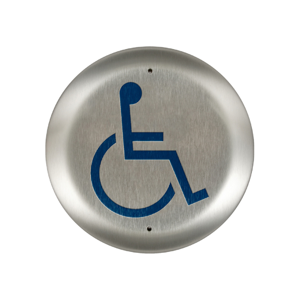 Hardwired low voltage actuator with round, stainless steel touch plate in 4 1/2" (114mm) diameter. Engraved blue filled handicap symbol conforms to most accessibility codes. Designed to mount in a flush or surface mount box (sold separately) in/on a vertical surface near the controlled door. Optional mounting in single gang electrical box (by others). Heavy industrial grade components provide vandal resistant mounting and weather resistant switch standard Handicap Logo with the added engraving of Push to Open