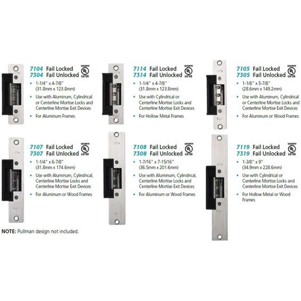 The 7 series centerline strikes accommodate 5/8” latch projections with various faceplate options to match most frame types. The RCI 7 series centerline strikes are compatible with a large range of door thicknesses from 1-3/8”-2-3/8”. These strikes function effectively with aluminum, cylindrical, centerline mortise locks, & exit devices. The RCI 7 series allows installers to adjust the strike pivot horizontally up to 1/8” for precise alignment.