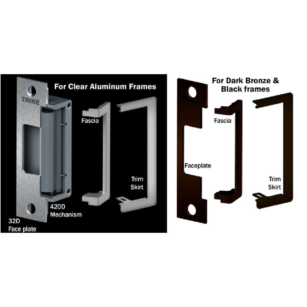 THE 4200CC-10B-32D Dual colored electric strike (includes pieces for a (32D)clear aluminum finish and a dark bronze finish) for use with cylindrical locks and deadlatches. Made especially for aluminum frames, and for use with wood frames.