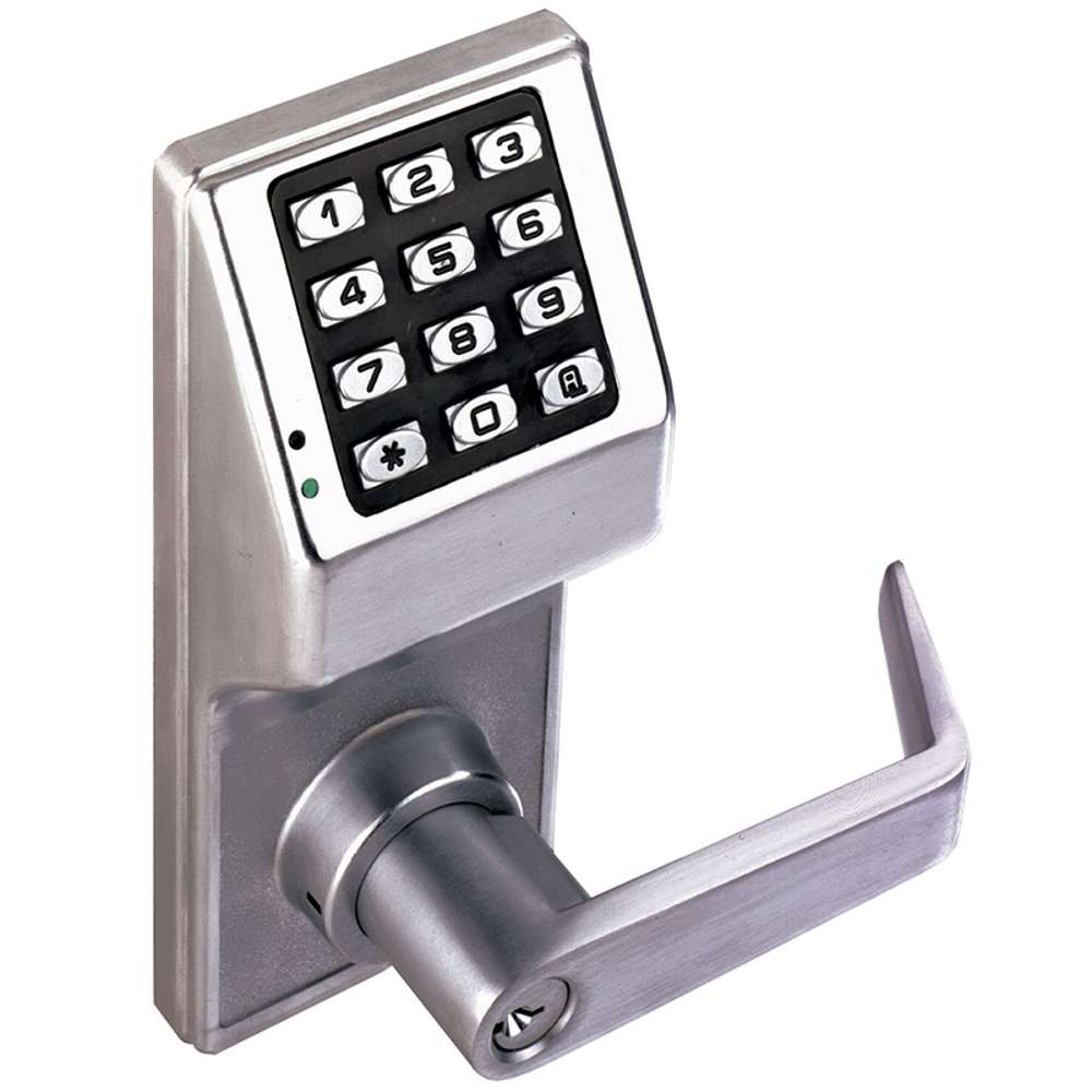 The Alarm Lock DL2775-US26D Pushbutton Cylindrical Door Lock is a non-handed lever lock that is easily installed and has a lot of versatility. It is battery operated with AA batteries, which allows it to operate independently, but it can also work with a group or total multi-level user lockout codes. It accommodates up to 100 different user codes of 3 to 5 digits each, and the keypad is fully programmable itself. It is all metal with 12 buttons total. This cylindrical door lock also features an audiovisual entry indicator on the front.