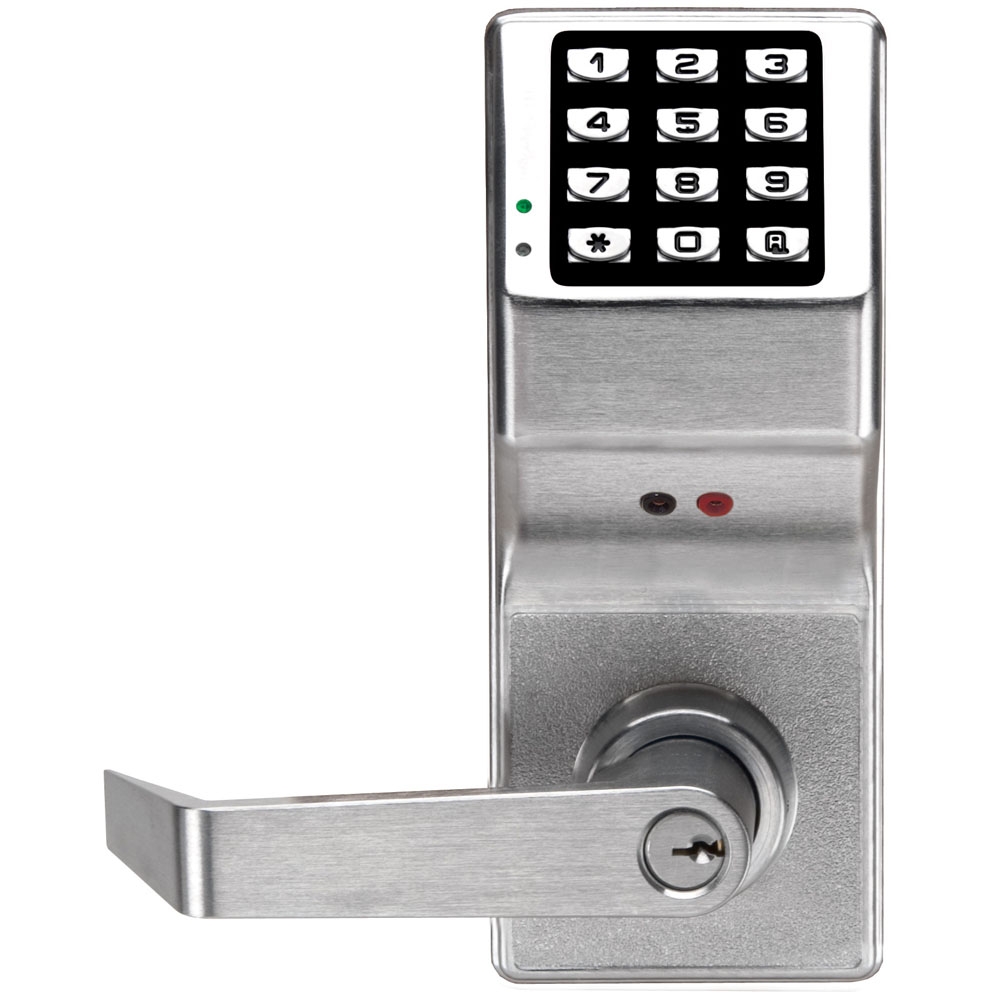 The Alarm Lock DL2800 Pushbutton Cylindrical Door Lock is one of the most popular standalone pushbutton cylindrical door locks. It is a non-handed lever lock that is easily installed and has a great amount of versatility. It is battery operated with AA batteries, which allows it to operate independently, but it can also work with a group or total multi-level user lockout codes. It accommodates up to 200 different user codes of 3 to 5 digits each, and the keypad is fully programmable itself. It is all metal with 12 buttons total. This cylindrical door lock also features an audiovisual entry indicator on the front.