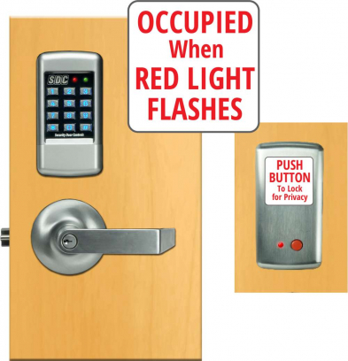 E75KL and E75PL models feature a privacy function that locks the keypad by engaging the privacy button on the inside, and the red LED on the outside flashes to indicate room occupation. Turning the inside lever upon exit deactivates the privacy function. In case of emergency, the privacy function can be overridden via key or master code. E75KL and E75PL modes are the perfect low-cost standalone solution for new or retrofitting of service stations, convenience stores, fast food or coffee house restroom facilities.