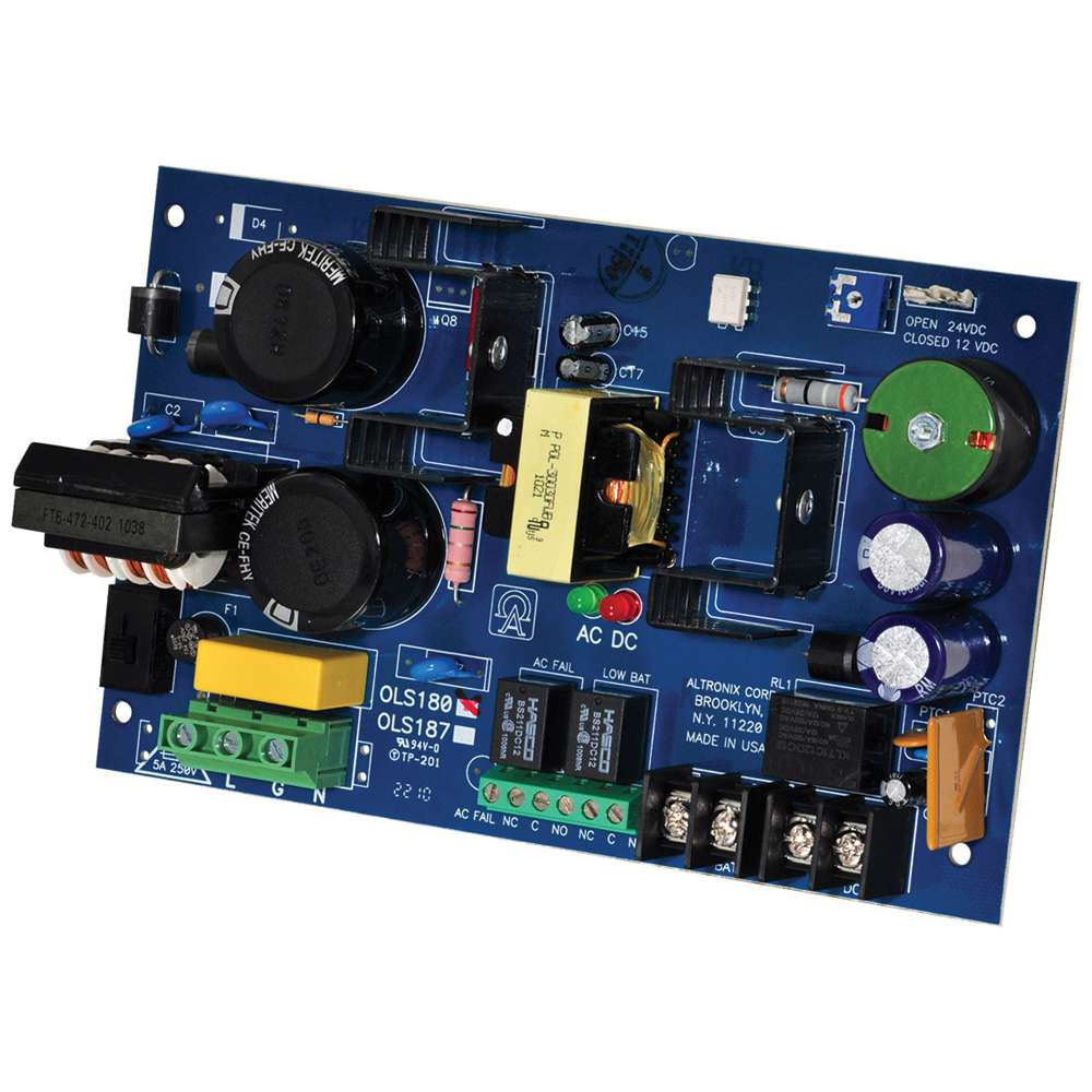 Altronix OLS180 Series power supply/charger converts a 115VAC, 60Hz input into a 12VDC or 24VDC output. This unit has a wide range of applications for access control and security system accessories that require additional power.