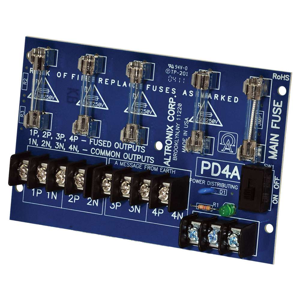 Altronix PD4 Series power distrubtion module is designed to convert a single AC or DC input into four (4) individually fuse protected outputs.