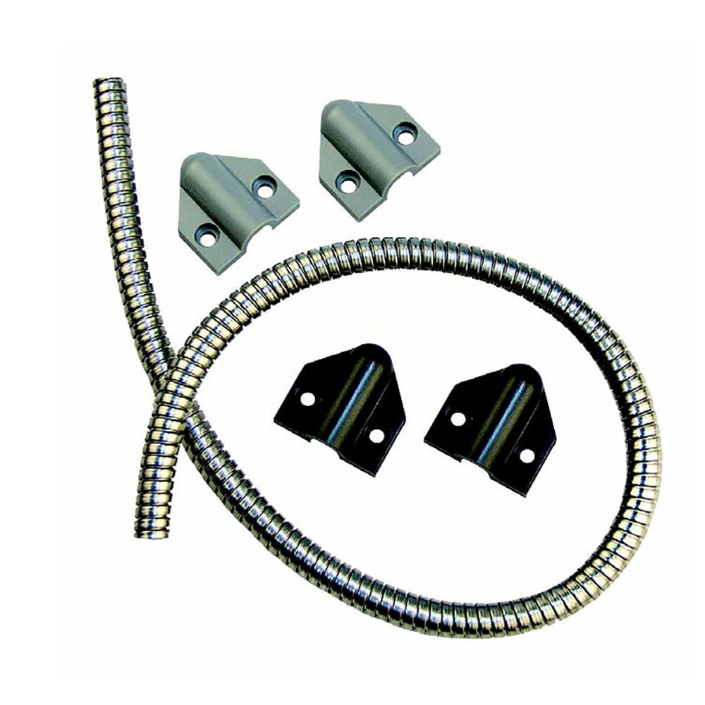 The Securitron TSB-C Door Cord with Gray Caps, 18" is an effective and economical solution for power transfer between a door frame and the door. It is constructed from a flexible, armored stainless steel cable, making it highly durable and suitable for various security applications.