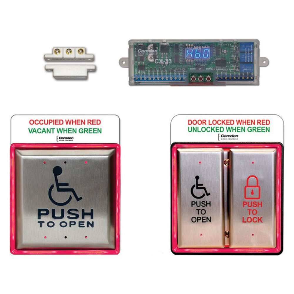 The Camden CX-WC13AXSM is a push restroom control kit with a 'Push to Lock' button as well as an 'Occupied When Lit' single gang LED indicator. The kit consists of a CX-33 advanced logic relay controller, a CM-2520/4854SE1 Combo switch, 2 x 4 'PUSH TO OPEN' & 'PUSH TO LOCK', Surface mount AURA™ illuminated enclosure and sign, a CM-45/454SE1 4-1/2 Push Plate switch, wheelchair & 'PUSH TO OPEN' with Surface mount AURA™ illuminated enclosure and sign, a CX-ED2079 Grade 2 ANSI electric strike with 3 faceplates, and a CX-MDA magnetic door contact.