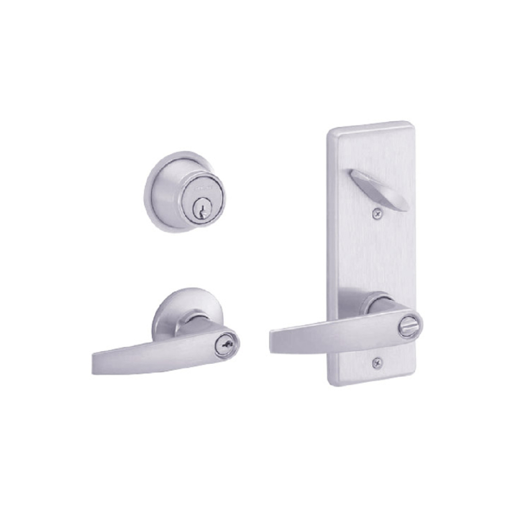 - Entrance, double locking - Deadbolt operated by key from outside or by turning unit from the inside. Bolt automatically deadlocks when fully thrown. Outside lever is unlocked by key from the outside or by turn-button on inside lever. Turn inside lever to simultaneously released deadbolt and latchbolt for immediate exit. Latch automatically deadlocks when door is closed.