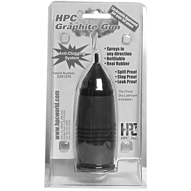 HPC's Graphite Gun is so unique that it earned a U.S. Patent! It sprays in any direction. Use HPC's Graphite Gun prior to picking to loosen tight wafers or pins. Graphite is also an excellent lubricant for machines. The Graphite Gun contains approximately 1/3 oz. (8.5g) of natural flake graphite and is refillable with HPC's Bulk Graphite (No. GG-16).