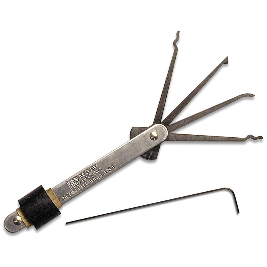 The Jackknife Pick Set is a complete pick set shaped like a folding pocket knife. It has 2 rakes, 1 diamond, 1 hook, and 1 tension tool, made of spring steel. Measures: .75" x 4" (2 x 10 cm).