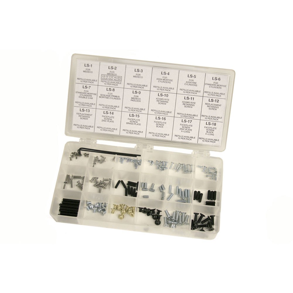 An assortment containing 18 of the most commonly used and misplaced screws that are required when servicing locks. The LSA-1 kit contains mortise cylinder cam screws, cylinder set screws, face plate screws and others than can be missing or lost when on the job. Also included are the allen wrenches needed for the allen screws used in the kit. A handy assortment that will pay for itself the first time that its used.