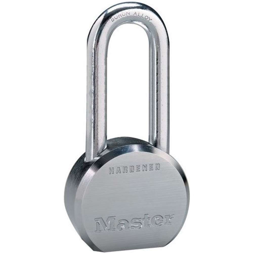 Master Lock's Pro Series round, solid steel lock body is chrome-plated for rust resistance. The hardened boron shackle and dual-ball locking mechanism prevents an attacker form cutting or pulling the lock open. The rekeyable cylinder can be swapped out in a matter of seconds, allowing this padlock to be used at multiple job sites or key systems.