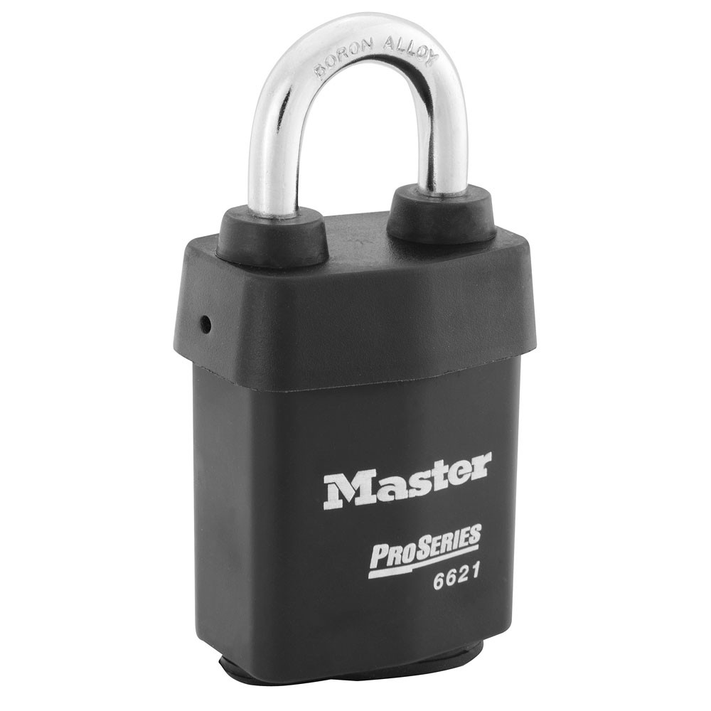 The Master Lock No. 6621,6627 ProSeries® Weather Tough® Covered Laminated Padlock features a heavy steel body to withstand physical attack and a hardened boron alloy shackle for superior cut resistance. Padlock is supplied without cylinder to match this padlock to your security door locks. The exclusive cover protects from water, ice, dirt and grime.