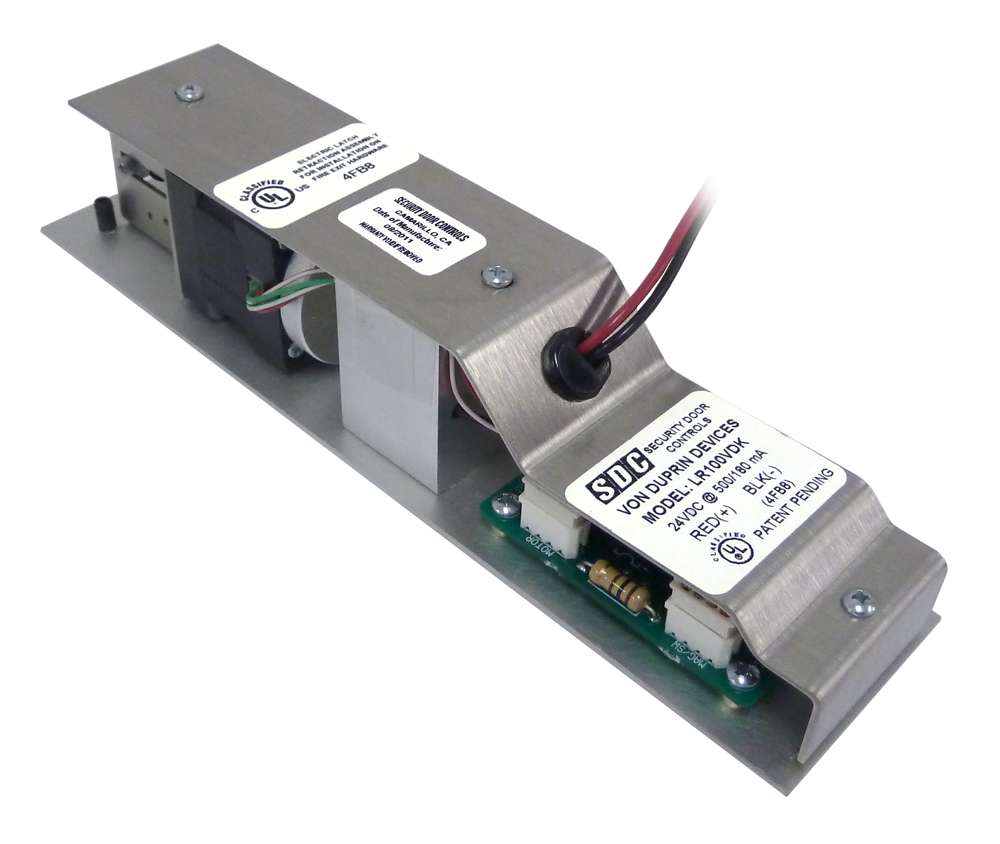 SDC’s QuietDuo™ LR100 series retrofit electric latch retraction kits enable electric access control and dogging of panic and fire rated mechanical exit devices. When energized the motor retracts the exit device latch and pulls the pushpad into the dogged (depressed) position enabling momentary or sustained push and pull operation of the door. The latch retraction mechanism may be activated by an access control, remote control device or building automation system. No door sequencer is required for a pair of manual doors when connected to a suitable power supply. The exit device always provides uninhibited egress